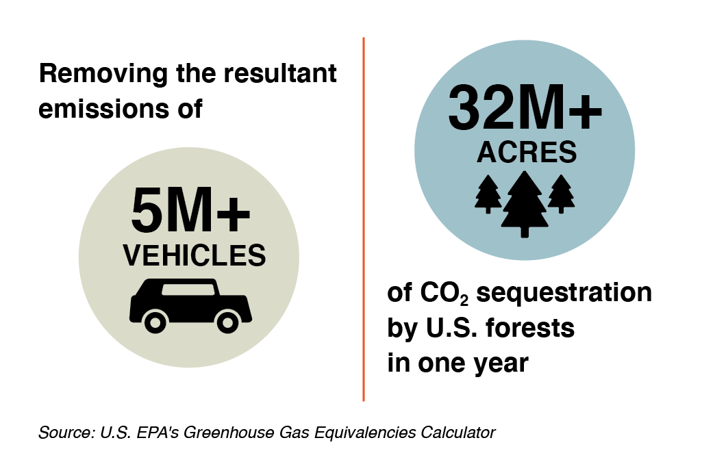 In 2020, shipping with BNSF enabled our customers to reduce their total carbon emissions by 24.7 million metric tons. This carbon savings is equivalent to: