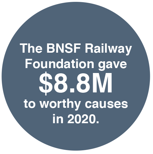 The primary way that BNSF contributes to worthy causes in our communities is through the BNSF Railway Foundation. In 2020, through scholarships, funding for community groups and other endeavors, the BNSF Railway Foundation gave $8.8 million to charitable organizations.