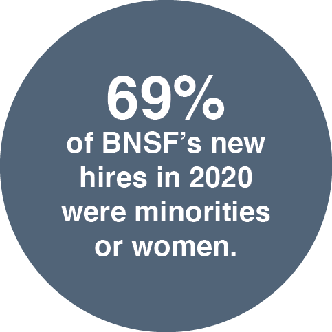 Our diversity makes BNSF a stronger company. Our culture of inclusion helps support our communities and the careers of our team. One measure of our commitment to diversity: In 2020, 69% of our new hires were minorities or women. We also champion diversity by participating in scholarship programs that benefit minority students, including Girls Inc., the Hispanic Women’s Network of North Texas and the National Association of Asian Americans. The BNSF Railway Foundation also supports organizations such as the American Indian Science and Engineering Society and the United Negro College Fund.