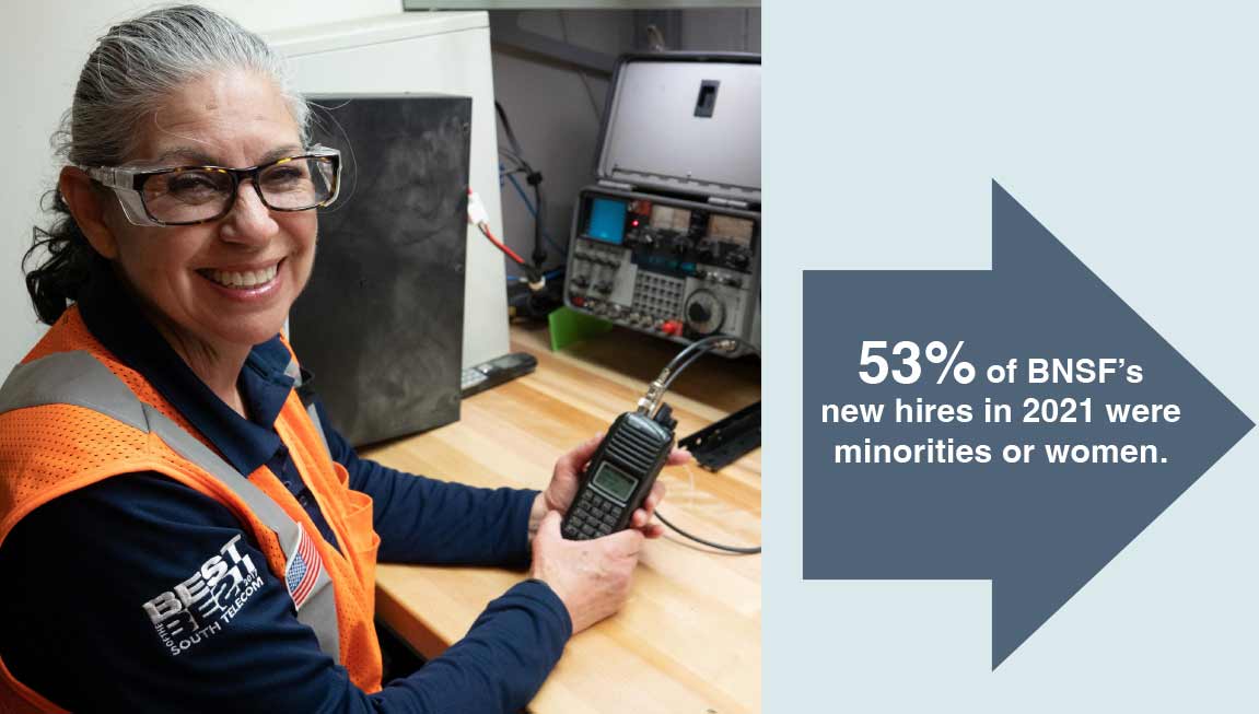 Our diversity and culture of inclusion make BNSF a better, more capable company. In 2021, 53% of new BNSF hires were minorities or women. Other ways we support diversity include participating in scholarship programs that benefit minority students, including Girls Inc., the Hispanic Women’s Network of North Texas and the National Association of Asian Americans. And the BNSF Railway Foundation supports organizations such as the American Indian Science and Engineering Society and the United Negro College Fund. Recognition includes being ranked #6 on Forbes’ 2021 list of America’s Best Employers for Women and recognized as a Top 50 Workplace for Indigenous STEM Professionals.