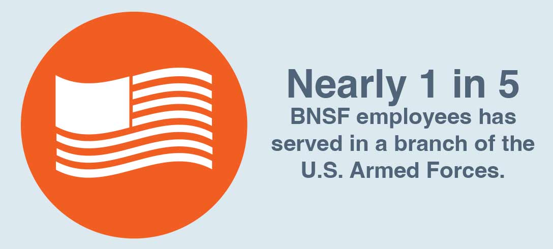 More than 6,200 BNSF employees are either military veterans or are still serving in the Guard or Reserves. Supporting reservists is an established tradition at BNSF, with time off for training and deployment readily available. Our BRAVE (Business Resource and Veterans Engagement) group helps veterans, reservists and first responders engage with communities, build leadership skills and develop their careers. Recent recognition includes receiving the Military-Friendly Award and being named a Top Employer for U.S. Military Veterans.