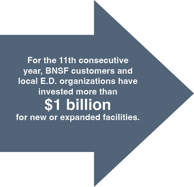 BNSF is always eager to support our customers who are ready to grow, increase their rail shipments, locate their facilities on or near our network and create community jobs. In 2021, BNSF customers and local economic development organizations invested approximately $1.5 billion to establish or expand rail-served facilities. This impressive investment is expected to create more than 1,700 jobs in local communities.